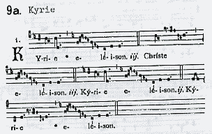 グローリア、キリエ、サンクトゥス、アニュースデイ等が日課として通常歌われていたようですが、その中からキリエの楽譜を抜き出してみました。↓
